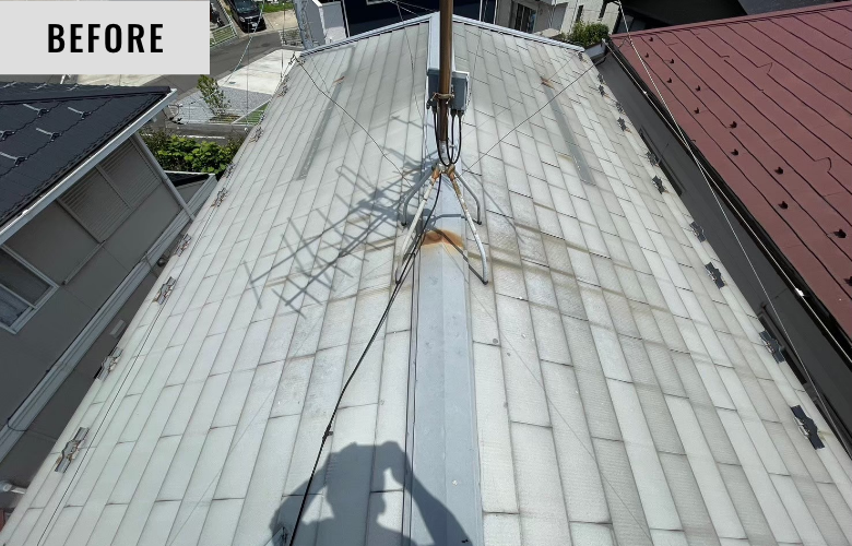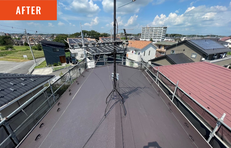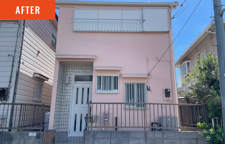 施工者コメント | 長年の紫外線や雨風により色褪せていた外壁には、日本ペイントの高耐候塗料。 外壁には【パーフェクトトップ ND-490】を使用。 やさしく柔らかなピンク系の色合いが、建物全体を明るく華やかな印象に演出します。 可愛らしさと品の良さを兼ね備えた色味で、ご家族にもご好評いただきました。 劣化していた屋根板金部分には新たな板金材を重ねて施工(カバー工法)し、防水性・耐久性の向上と見た目の一新を図りました。 重厚感のあるブラウンカラーが、外壁のやわらかな色調と美しいコントラストを生み、上品でバランスの取れた外観に仕上がっています。 お客様からは「屋根と外壁の色の組み合わせがとても気に入っています」とのお声をいただきました。 |