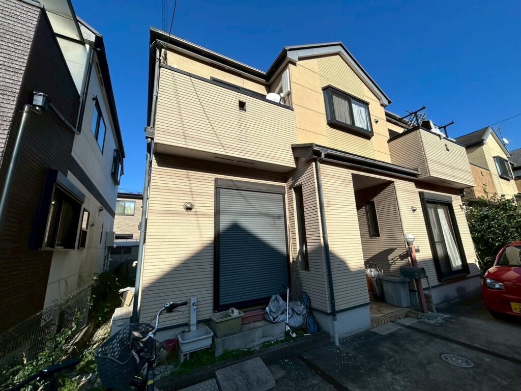 外壁は長年の紫外線や雨風の影響により、全体的に色あせや艶引けが見られる状態でした。塗膜の防水性も徐々に低下しており、外壁本来の保護機能が弱くなっている様子が確認できました。このまま放置すると雨水の浸入やさらなる劣化につながる可能性があるため、塗装による保護機能の回復と美観の改善が必要な状態でした。