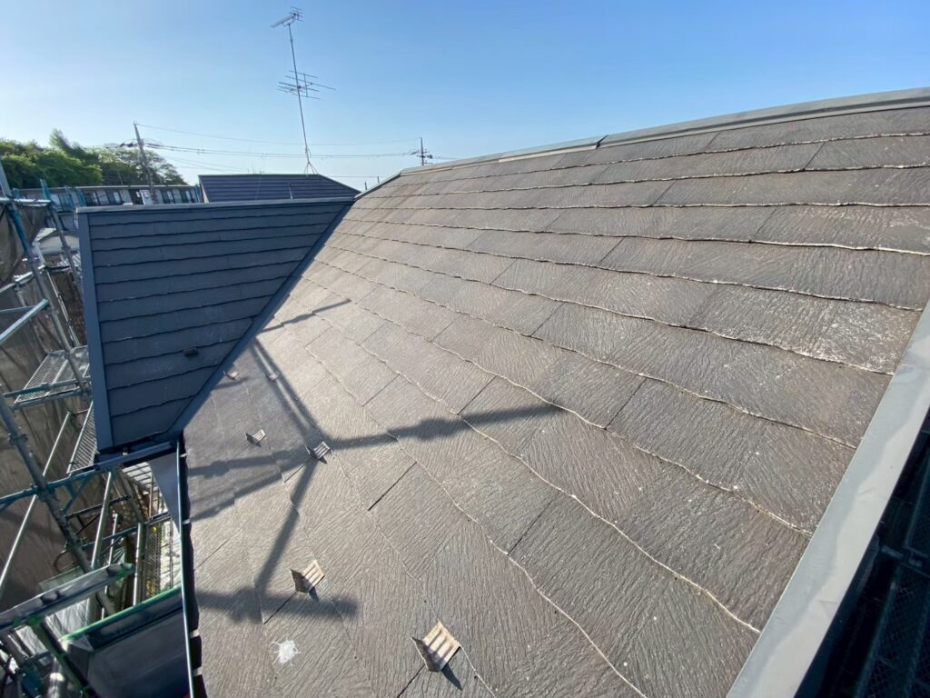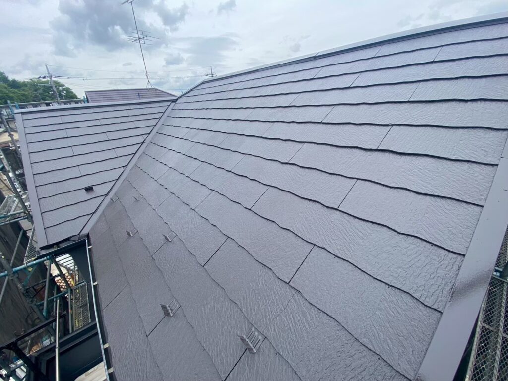 屋根は外壁との調和を考えたダークブラウン系カラーで塗装し、重厚感のある落ち着いた印象に仕上がりました。外壁とのバランスも良く、建物全体に統一感のある外観となっています。塗装により屋根表面の保護機能も回復し、紫外線や雨風からしっかりと屋根材を守ることで、耐久性と防水性の向上にもつながりました。