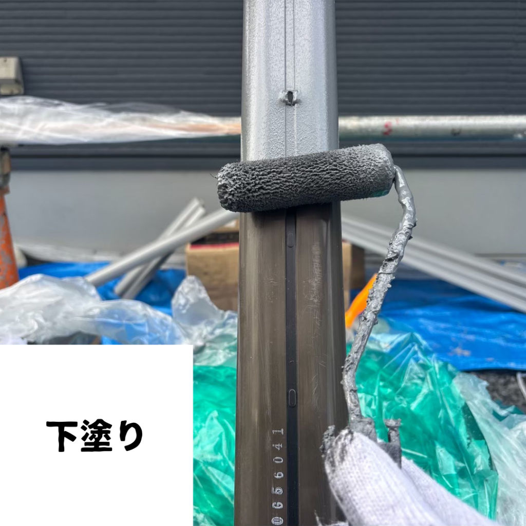 • スリムダクトは一度取り外してから塗装を行いました。外さずに塗ると裏側や外壁との接地部分が塗れないため、丁寧な施工には取り外しが重要です。下塗りでは塗料の密着性を高める工程を行い、長持ちする塗膜の土台を作っています。