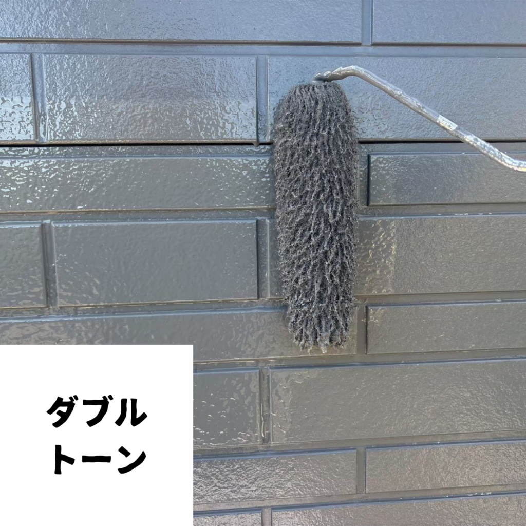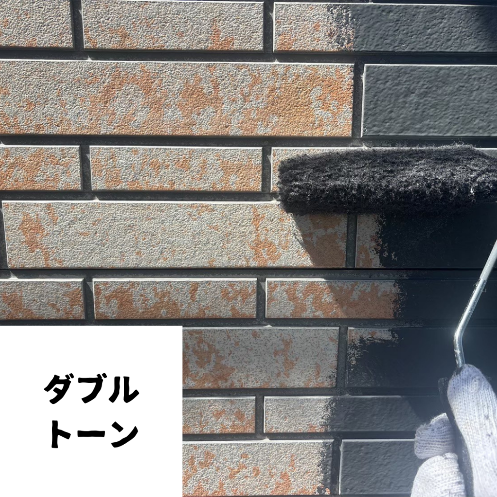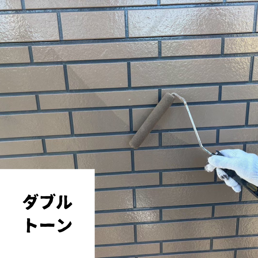 外壁のタイル調サイディングの意匠を活かすため、通常の単色塗装ではなくダブルトーン工法をご提案しました。