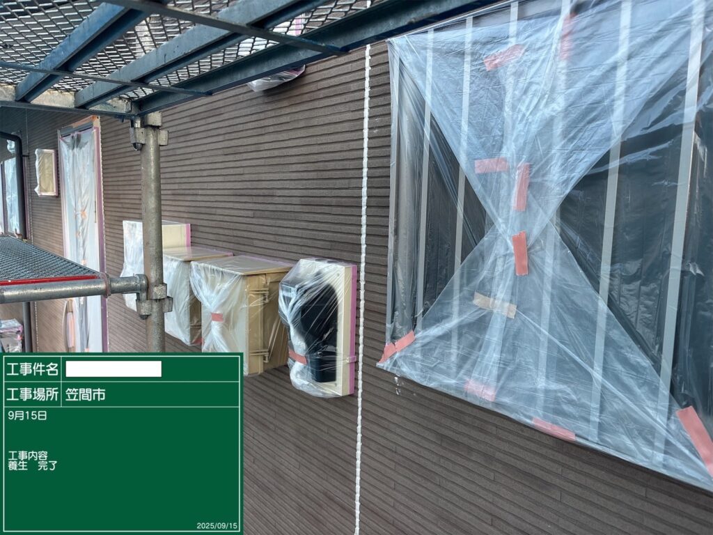 塗装前に、外壁や金属部分にあるひび割れ・サビ・欠け・古い塗膜などをしっかり補修し、周囲をビニールなどで保護する大事な工程です。