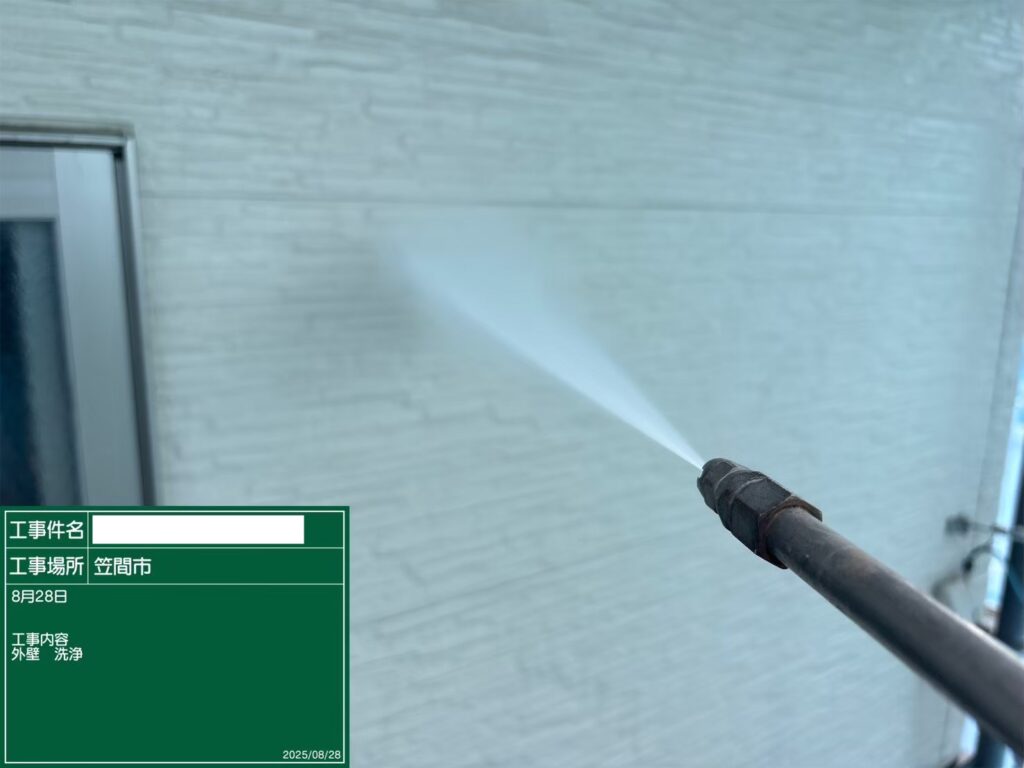 続いて「高圧洗浄」で外壁の汚れ、カビ、コケ、古い塗膜をしっかり落とします。